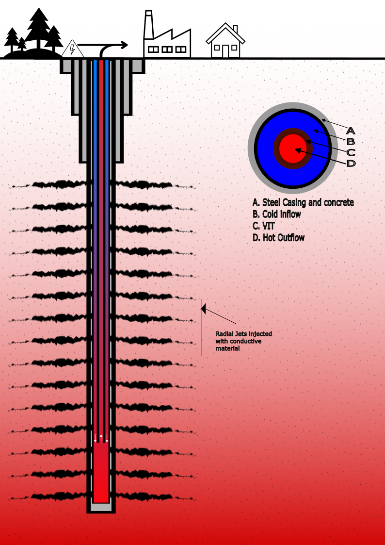 We plan to use radial jet technology that creates channels that branch from the main well, which will be filled with highly conductive materials such as graphite based composites or similar. These adaptations aim to facilitate more effective heat conduction from surrounding rocks and enable optimal heat transport. The positioning and length of the lateral channels are customizable to suit the specific geological conditions of each site. This ensures that the system can maximize heat extraction and be versatile, functioning efficiently across a variety of geological environments.